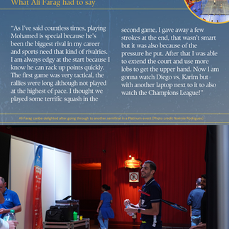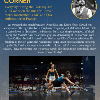 Diego Elias put on an amazing performance to beat Karim Gawad in the quarters. The Peruvian Puma’s win is our top story in Issue 4 of the Paris Squash 2024 magazine.